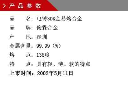第二、兼容性;電鑄3DK金易熔合金既可單獨用于焊接,又可單獨用于控制溫度,也能焊接與控溫同時并用,安全可靠。